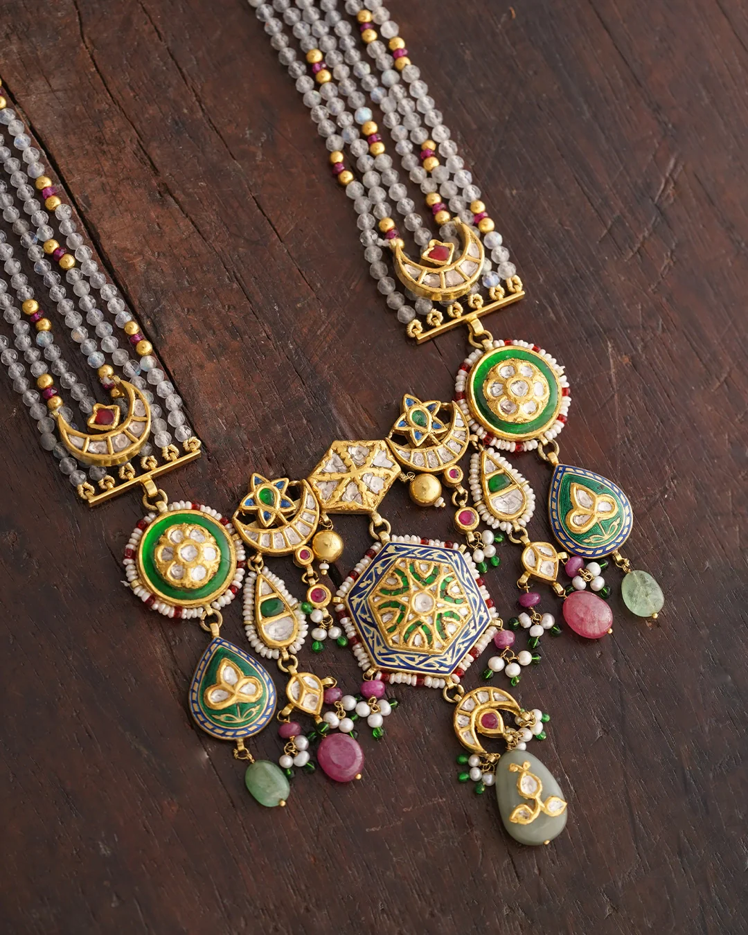 At the heart of this long neckpiece is a detailed circular unit, dressed in polki/uncut diamonds, using the traditional jadai technique. The green khula meena (open enamel) painted using the champlevé technique highlights the brilliance of the diamonds through contrast, ensuring the eye is drawn to the center. handcrafted in gold, with rows and rows of polki andemerald studded elements designed around a centre hexagonal unit with intricate blue enameling, all strung on lines of faceted labradorite.