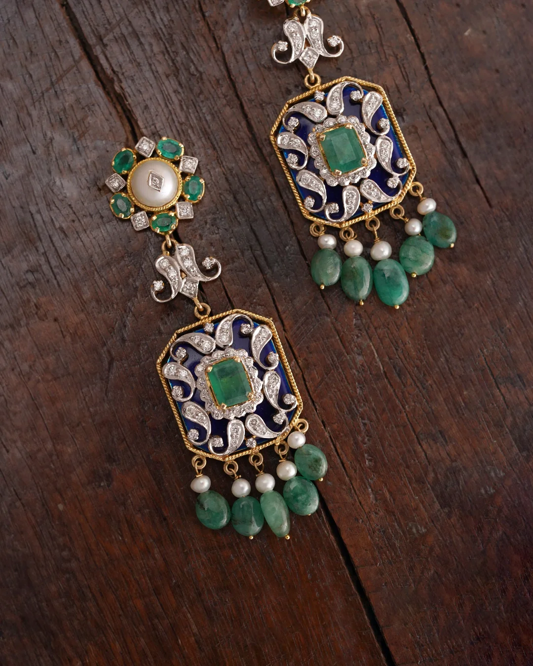 Our Anya Earrings, in royal blue, are fit for a queen. The earrings are hand-worked in gold and embellished with natural brilliant-cut diamonds and stunning emeralds that offer a beautiful contrast. The body, featuring skillfully done blue enamel, connects to a cultured pearl stud and is finished with drops of emeralds and cultured pearls.