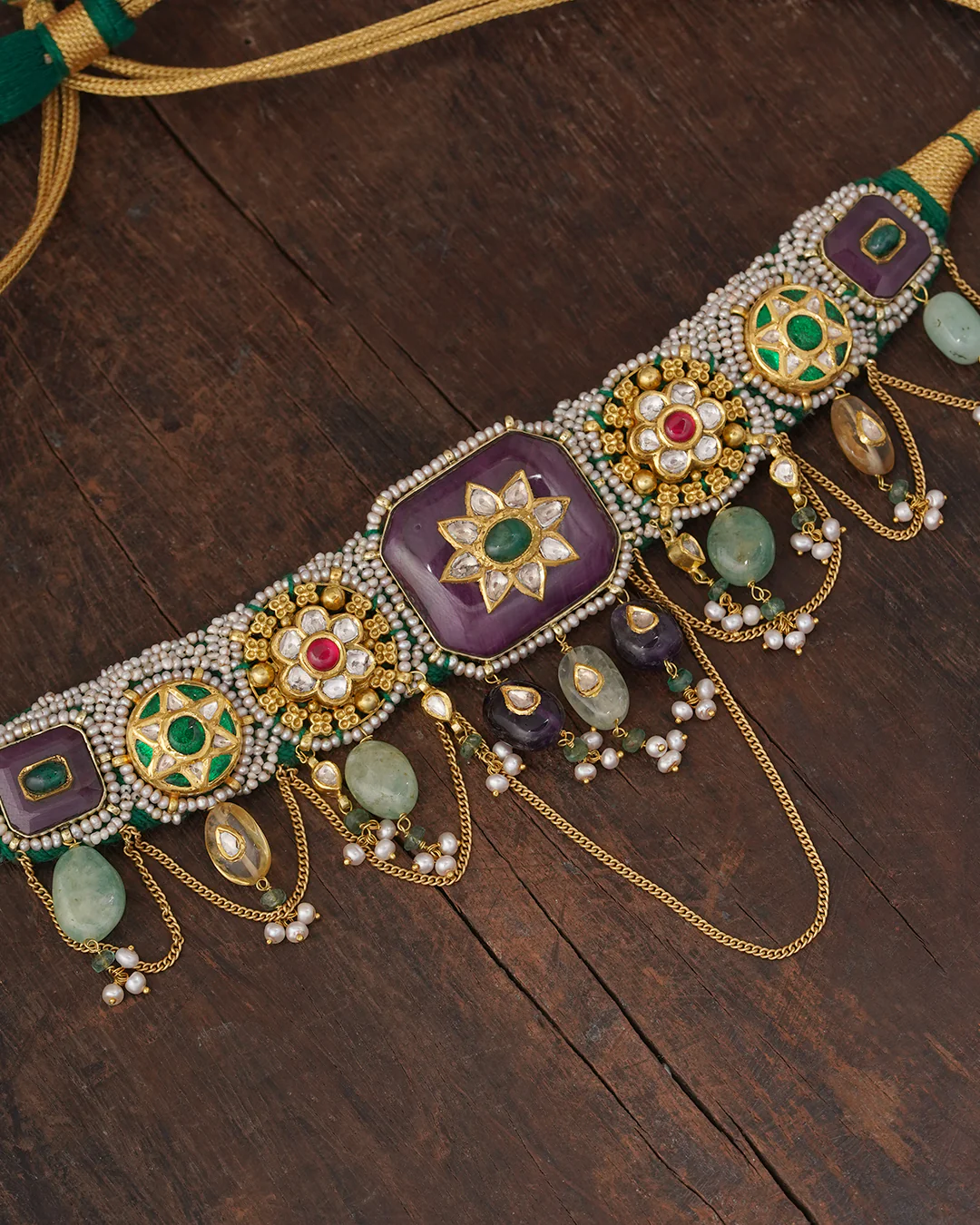 Skillful craftsmanship meets rich colors and textures with the Farida choker. This handcrafted piece is for lovers of unique jewelry designs. The choker, with polki/uncut diamonds, enamel, and gemstones set on a beautiful green cotton thread base, comes with suspended chains - a concept straight out of Aurus sketchbooks.