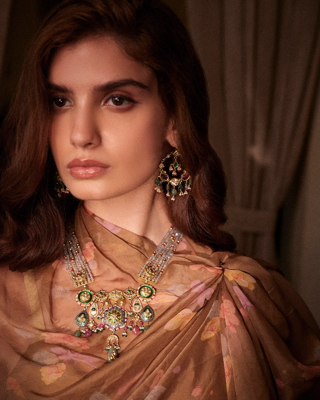 A harmonious blend of classic techniques and modern design sensibilities, each chaandbali is dressed in uncut diamonds and carved rubies set into paisley shaped elements.
