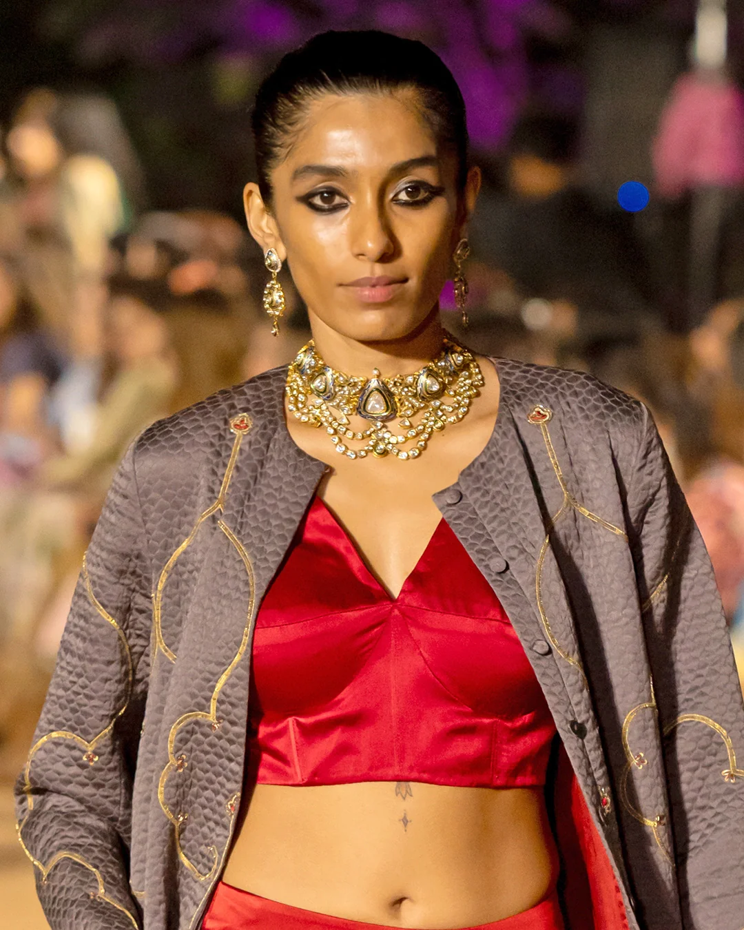 We imagine this statement polki choker necklace for women worn well with reds and muted colors for a modern look, and it would look equally stunning as a feature piece of a bridal ensemble. You can go for big polki studs to get all the attention on this stunner!