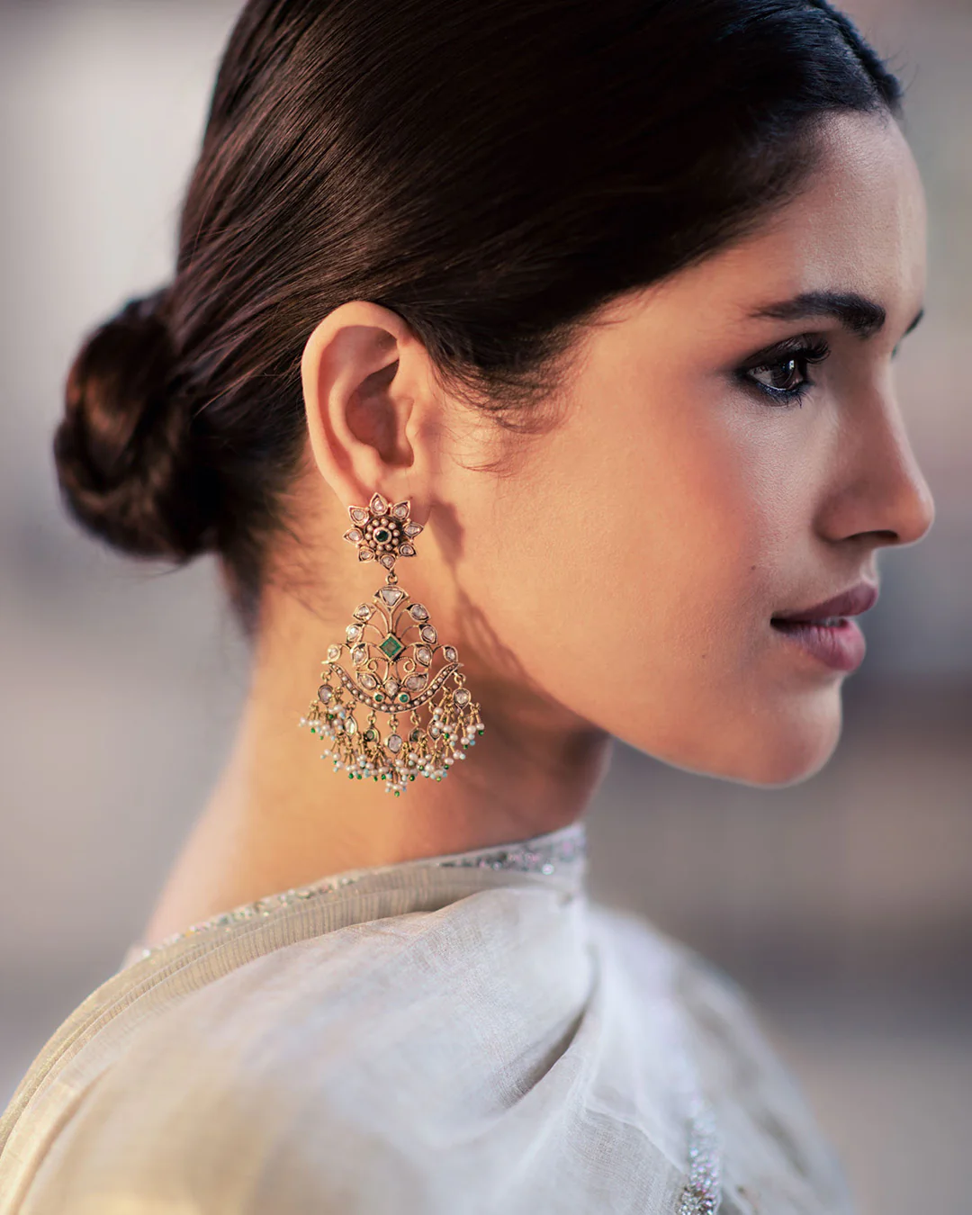 These Hyderabadi style uncut diamond encrusted statement earrings, with the old world charm from the grey finish, are worked in gold and finished with intricate details of pearl and turquoise drops.