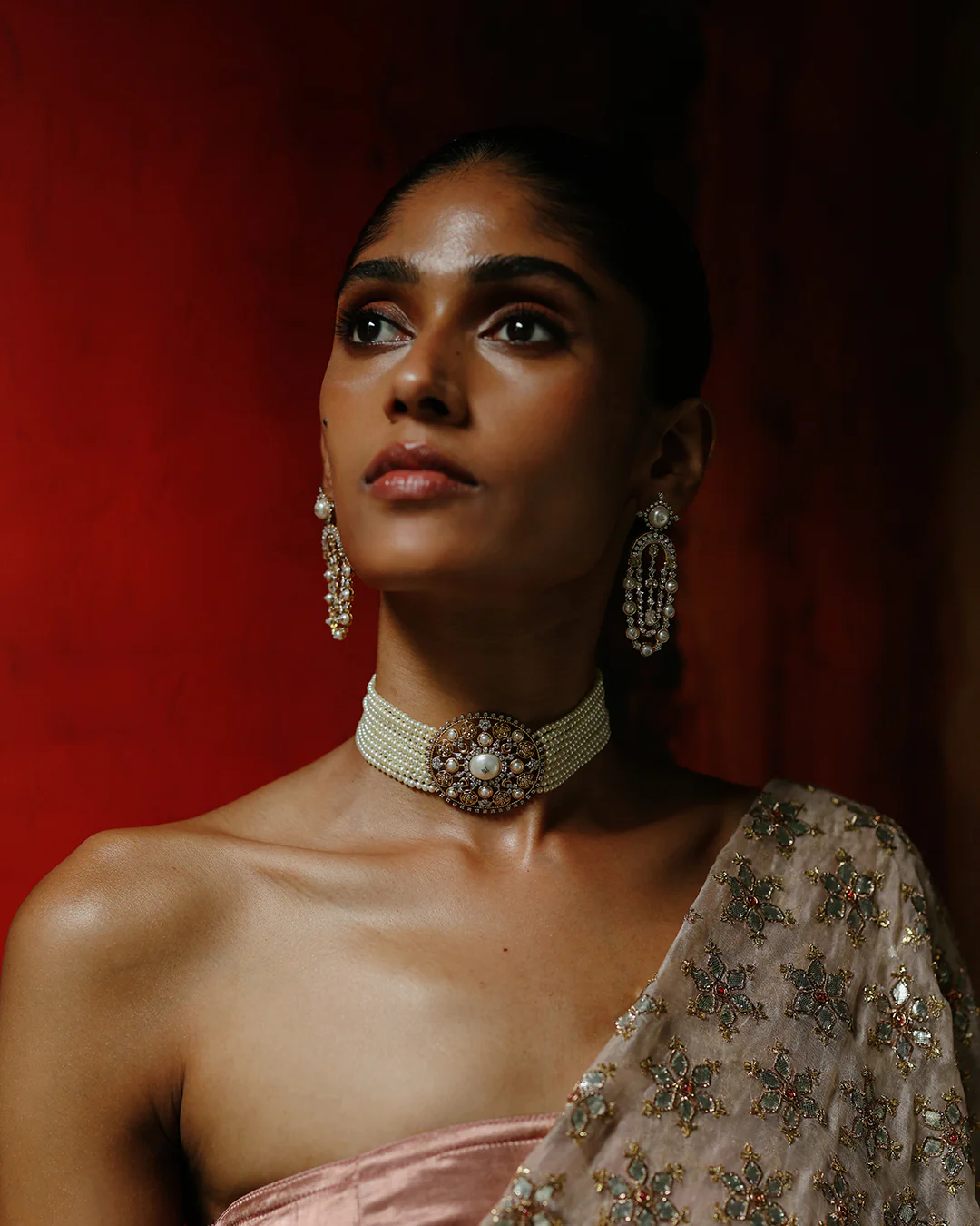 You may pair this choker necklace with either diamond and pearl chandelier earrings for an elevated look or minimalistic stud earrings to highlight the choker.