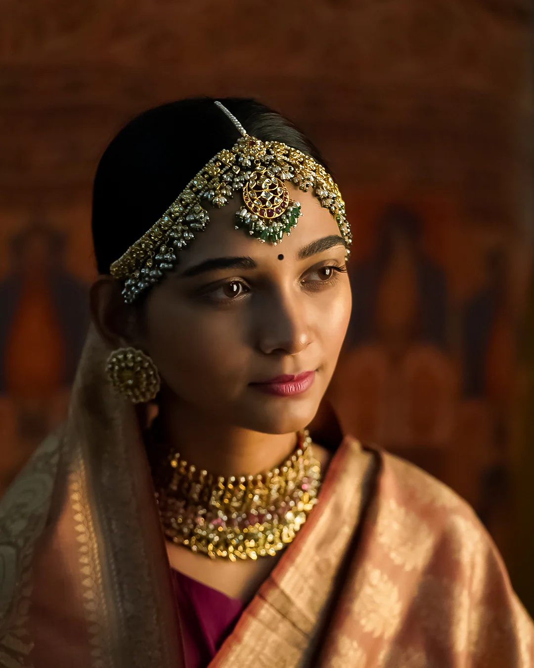 The Medha pearl ruby and gold mathapatti has an aura of opulent grace surrounding it. Handcrafted in gold and Polki/uncut diamonds, the mathapatti features a centerpiece consisting of a floral top motif, a second unit made of Polki/uncut diamonds, and the iconic "Chaand" motif made of rubies. The centerpiece is flanked on both sides by pattis of repeating units of clover leaf motifs. Pearl drops, emeralds, and precious green beads finish this gorgeous mathapatti. It goes well with our majestic Medha necklace to give you a rich wedding look!