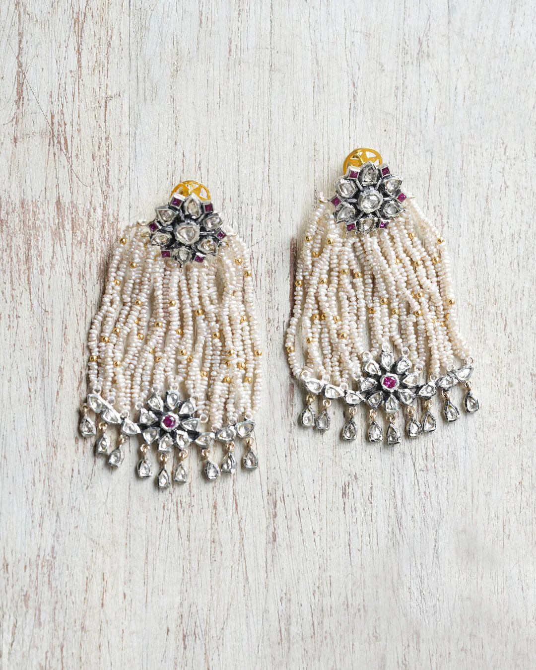 Embellished with rose-cut diamonds and cultured pearls, the Mogra earrings offer understated elegance in neutral tones of white and silver . These exquisite earrings worked in gold are a product of revisiting the Pachhikaam technique of making jewelry. Do not miss the rubies that add a touch of romantic red highlight.