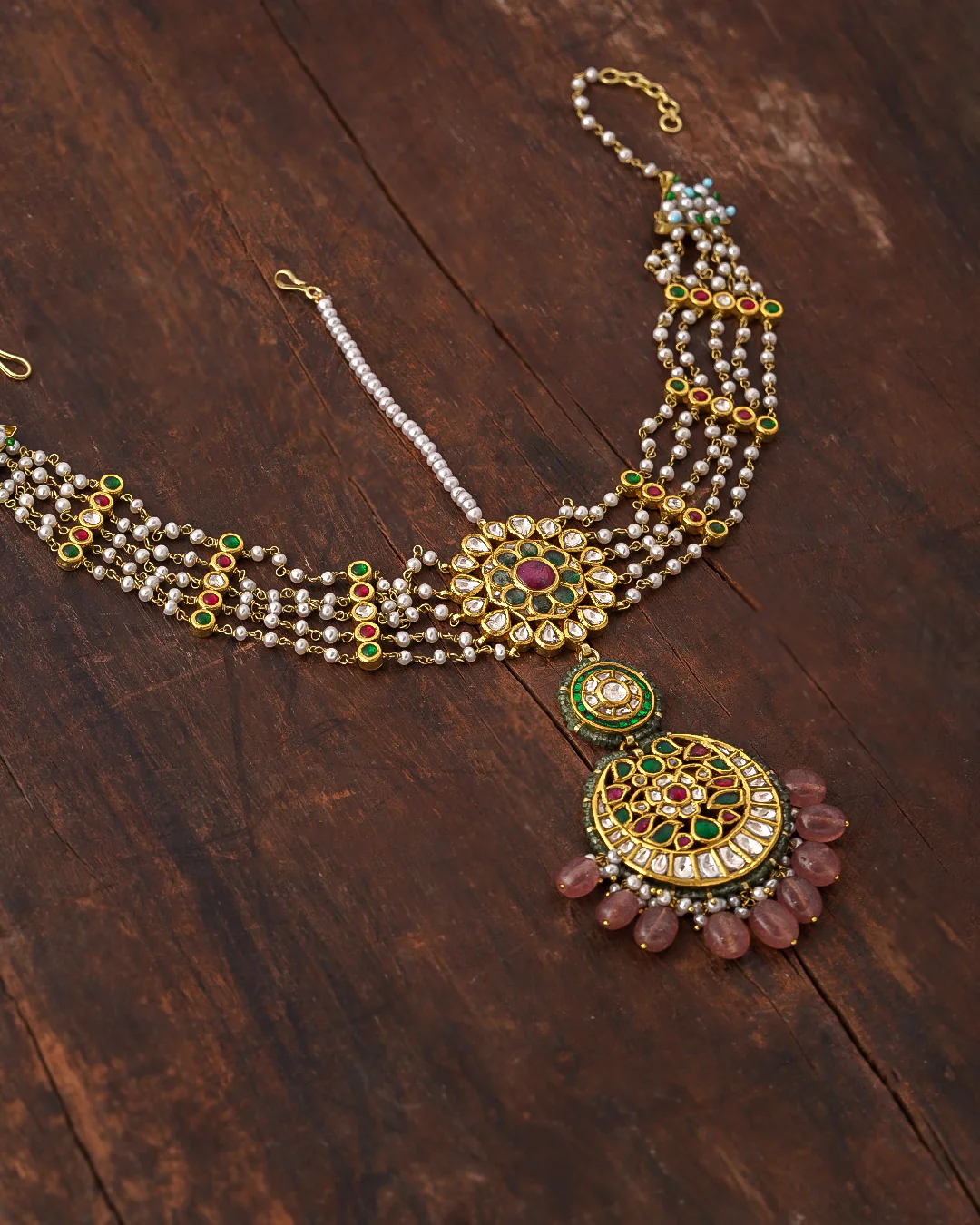 Radiating with a riot of vivid colors, the Neeti Polki and pearl mathapatti for brides is an exquisite piece of Indian bridal jewelry in its own right. This Polki and pearl mathapatti is handcrafted in gold and features a floral motif flanked by lines of evenly placed pearls, interspersed by precious stones in hand-pressed Kundan. The centerpiece that rests on the forehead features the iconic crescent chaand motif made of Polki/uncut diamonds and is finished with drops of precious stones.