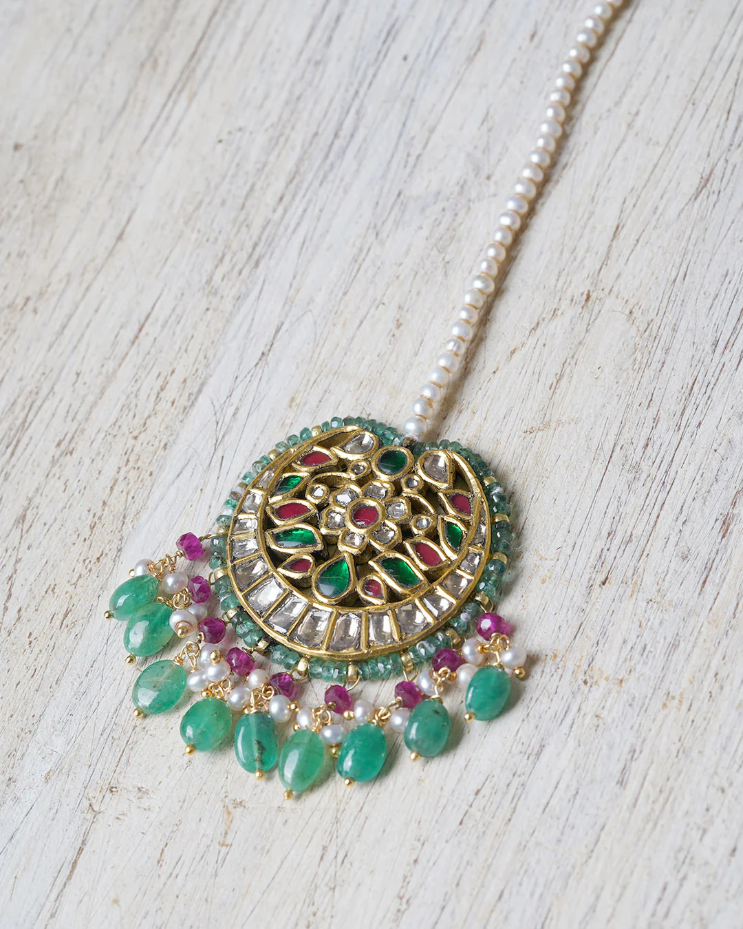 Crafted in gold and finished with emeralds, this maangtika features a chaand motif along with uncut diamond/polki units in green and red colours, all complete with details of pearls.