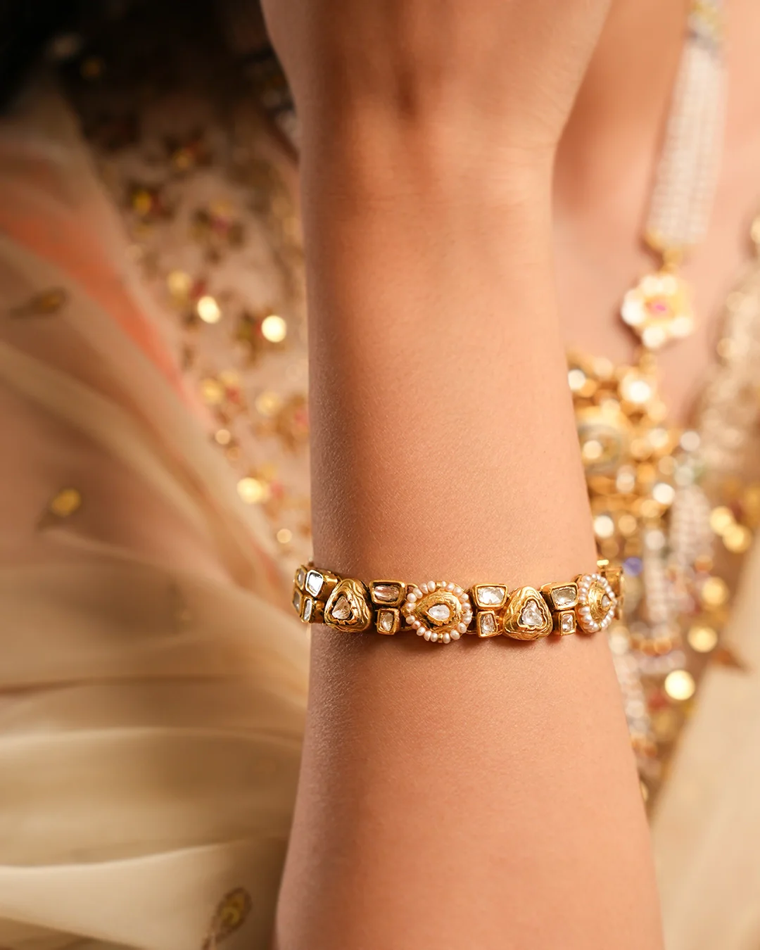 A statement gold bracelet dressed in polki/uncut diamonds using the traditional jadai technique. The process of finding polkis of the same size can take anywhere between 60 and 240 man-hours. The bracelet comprises alternating drop-shaped and triangular units dressed in polki and intricate chhilaai.