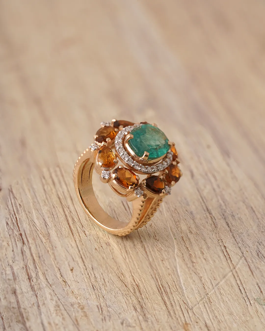 A cocktail ring handcrafted in gold and dressed in diamonds, yellow tourmalines, and an emerald.