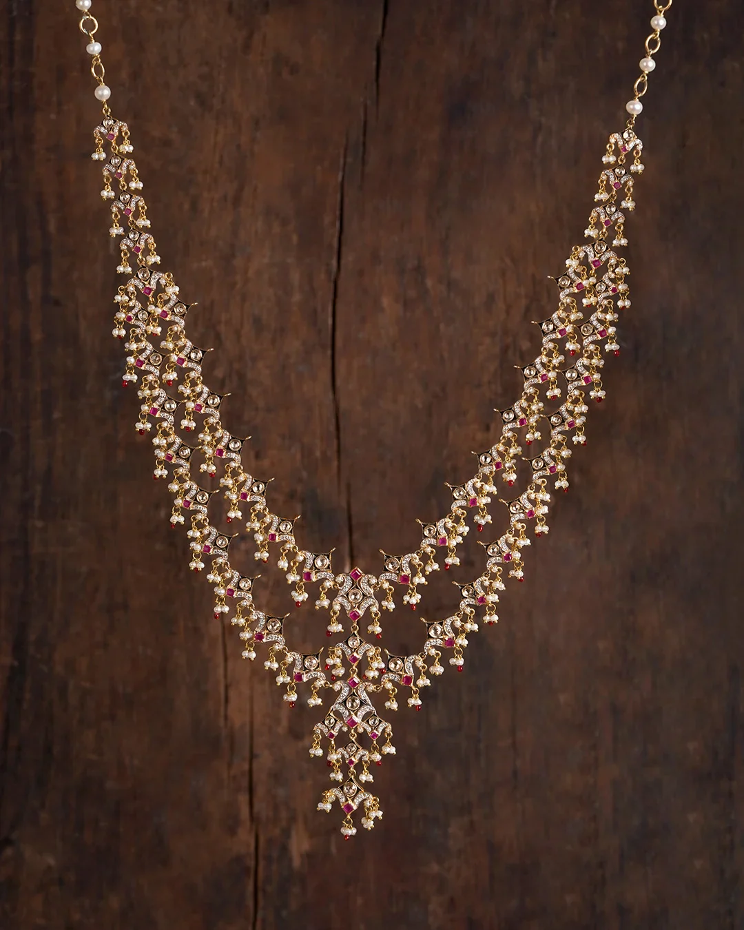 Each repeating unit comprises a rose-cut diamond framed within a black square using techniques inspired by Hyderabadi kaam, and two elongated leaves set with natural brilliant-cut diamonds emerging from a ruby. Two rows of this repeating pattern run along either side and meet at the center, where a similar motif forms the central unit. Suspended from all elements are fringes of cultured pearls, along with gold and red enameled beads. The design showcases 10 man-hours of skillful pirai, the craft of stringing beads using thin gold wire.
