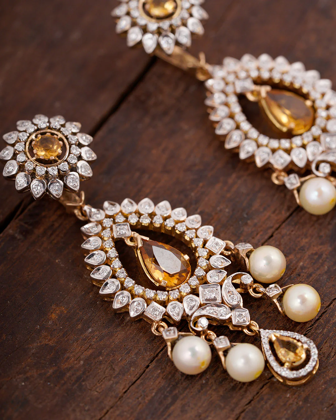 Crafted in 14K gold, these earrings illustrate a classic silhouette with rich hues of yellow citrine gemstones, accentuated with pavé- and prong-set brilliant-cut diamonds, and finished with cultured pearl drops.