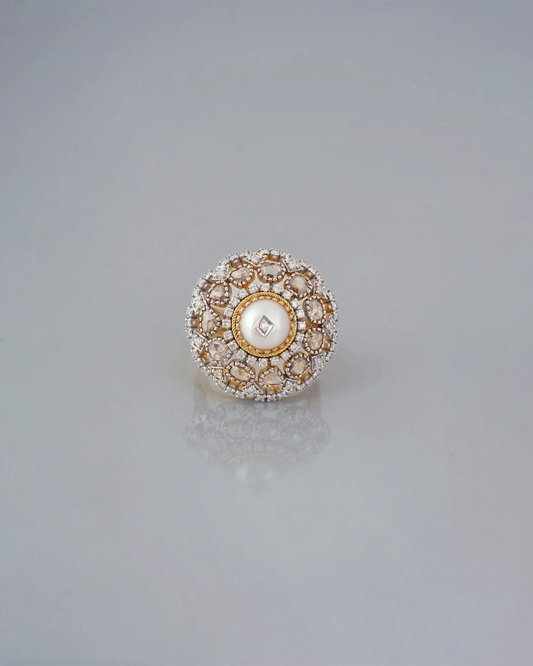 A diamond and pearl cocktail ring highlighting the timeless relationship of diamonds and pearls.