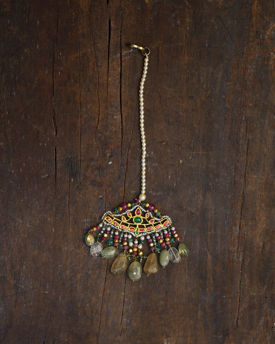 Opulence through raw, multi coloured gems and stones comes alive in the Vasant maangtika, which is a statement, kundan head accessory. It is handcrafted in gold and bordered with precious gem beads and further has a line of pearls going up after the ruby and emerald jadau motif.