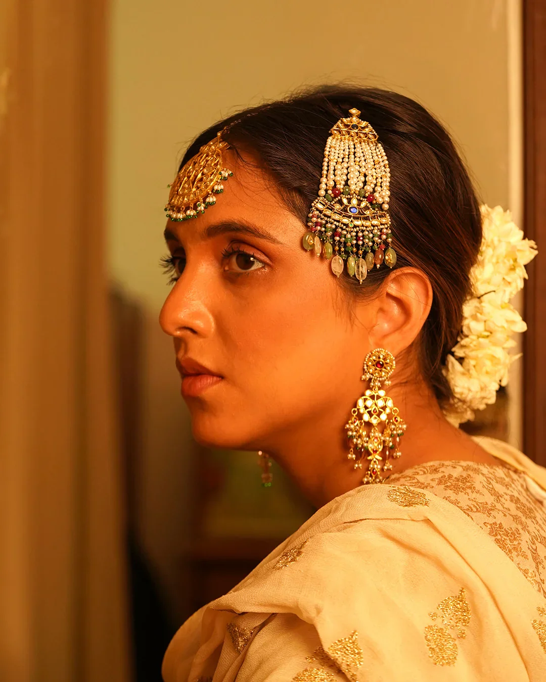 The Vasant gold and pearl passa is our contemporary take on the passa - an important piece of Indian head jewelry and a prominent part of the bridal trousseau of both Punjabi and Muslim brides. Also known as a jhoomar, this vintage piece of Indian head jewelry with a contemporary touch features two intricately handcrafted units of gold with kundan-pressed gemstones connected by lines of pearls interspersed by gold. Drops of precious gemstones of an earthy palette add the finishing touch.