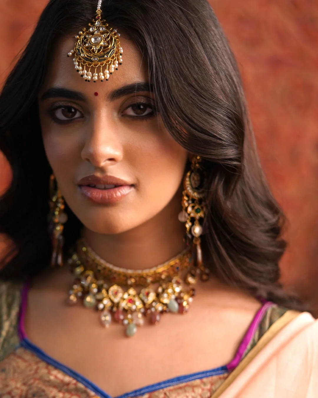 Rays of sophisticated elegance radiate from the Ved Polki gold maangtika through its adept craftsmanship. It features the iconic "Chaand" motif made using an agate stone onto which Polki/uncut diamonds are set with hand-pressed Kundan. The design gets its finishing touches through pops of red and beautiful pearls. Our Ved earrings complement them beautifully to make a complete set of face wedding jewelry.