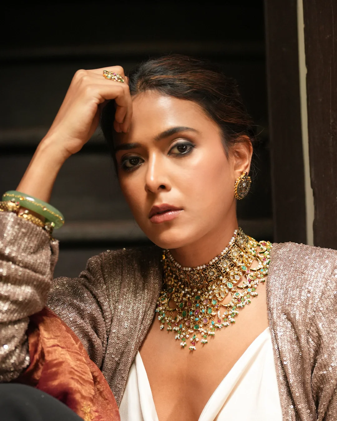 The choker consists of 8 square units decorated with phool/flower motifs, 4 on each side of the central chaand-phool unit, all bordered with pearls. The phool are dressed in polki/uncut diamonds using the traditional jadai technique, while the chaand is set with stone, kundan-set with diamonds. Suspended from the units are pearl and polki-set strands, connected by side loops embellished with smaller pearls.