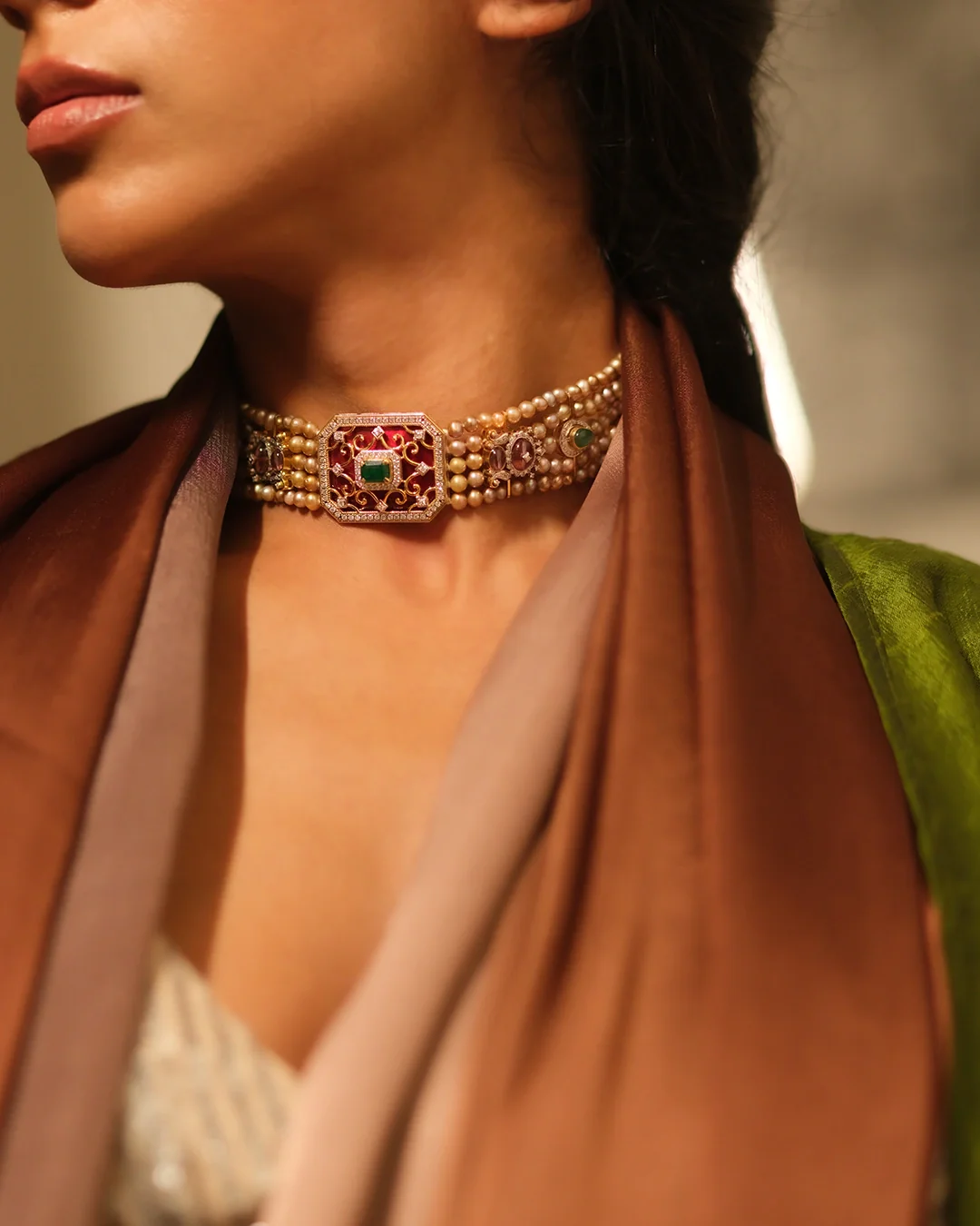 Handcrafted in gold, the 'Vira Choker' is finished with pearls and ruby drops. Our pearl based neckpiece holding an exquisite detailed blue enameled pendant in the center is worked in gold, highlighted with a pop of emerald and pave set diamonds. Strung with lines of antique pearls and the rich colors, this choker is just what you need for the festive days.